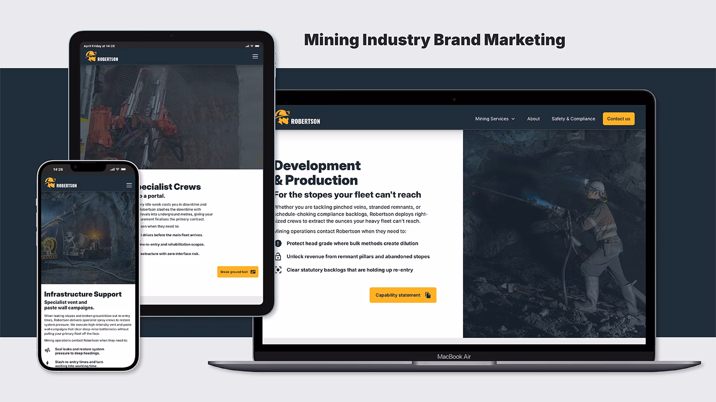 I led a full commercial repositioning for Robertson Mining Services. The works ranged from foundational strategy through to a complete digital build. The objective was clear: close the gap between how Robertson operates and how the market perceives them, enabling the business to compete credibly for higher-value contracts and attract the right clients as they scale.